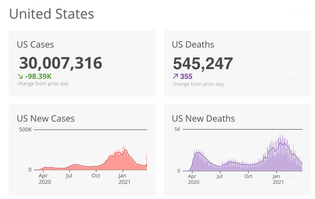 Eventually, I discovered Domo’s Coronavirus Tracker (the Tracker). I use Domo for data visualization at work, so I was already familiar with the platform. I randomly searched for it one day and was thrilled to find that they had developed their own pandemic reporting page. I quickly checked to see where they were gathering their data, and I was pleased with what I found. According to Domo, their data is “gathered every 10 minutes from credible sources, including WHO, CDC, Johns Hopkins University, Worldometer, IHME, The COVID Tracking Project, FRED, The New York Times, the Wikipedia compilation of world testing, SafeGraph, Foursquare, Thumbtack, SBA, Apple, Google, and data from AWS Data Exchange” (2021).
